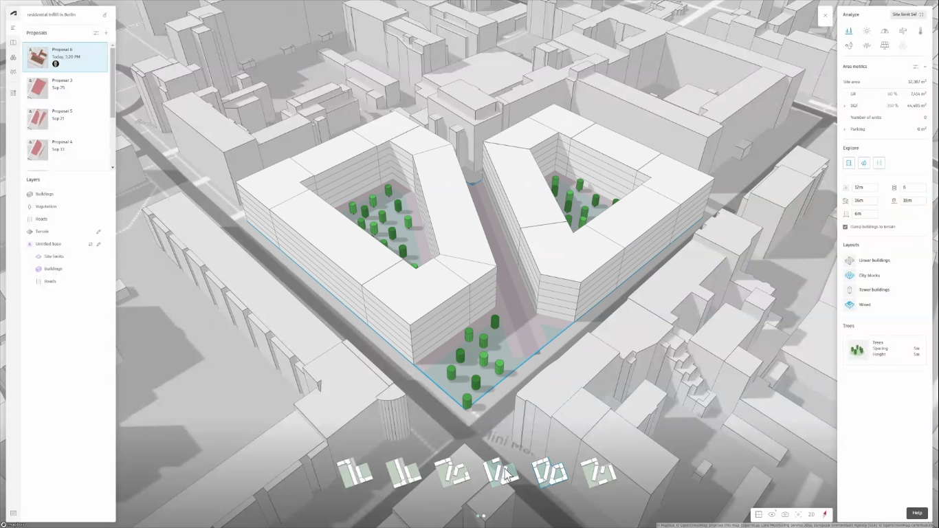 Estas características han sido revolucionarias para la ideación y optimización basada en datos en diferentes fases del proyecto. Comenzando con la volumetría, el conjunto inicial de herramientas de diseño generativo de Forma ayuda a responder la pregunta "¿qué pasaría si...?" en una fracción del tiempo que normalmente se tarda al evaluar un sitio. Se pueden generar rápidamente opciones de diseño, utilizando estos estudios de volumetría rápida para evaluar fácilmente la viabilidad de un sitio. Los métricos clave de área ayudan a monitorear los objetivos y considerar cualquier compromiso. Luego, se puede enviar la propuesta generada a los análisis rápidos de Forma para obtener una primera impresión de las condiciones de viento y ruido y la energía operativa. Para el diseño de estacionamientos, normalmente una tarea manual ingrata, la herramienta de estacionamiento de Forma se encarga felizmente de esto. Permite generar de manera eficiente opciones de estacionamiento para áreas cerradas según parámetros como dimensiones de lote, ancho de pasillo y número de pisos. Para estacionamientos al aire libre, se puede aprovechar la extensión opcional de estacionamiento TestFit, una herramienta de terceros. Combinar las ideas de ambas herramientas proporciona una visión más completa de las necesidades de estacionamiento ya en la etapa temprana, ayudando a crear una estrategia de estacionamiento más precisa y rápida.