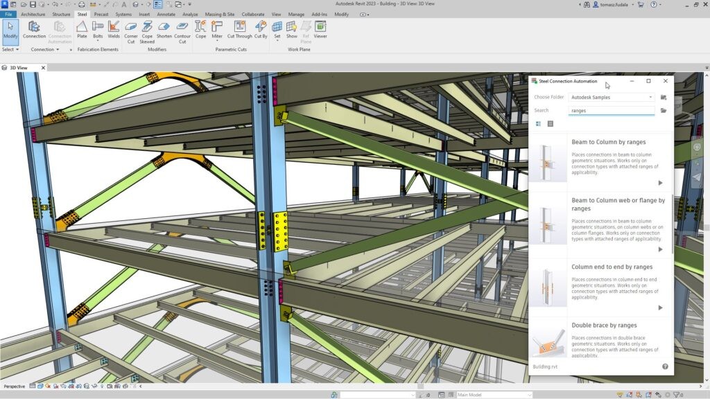 Otra característica valiosa de automatización es la Automatización de Conexiones de Acero en Revit, que asiste en el diseño de sistemas estructurales de acero, ayudando a los ingenieros estructurales a modelar la intención del diseño más rápido y estimar costos y constructibilidad con mayor precisión, especialmente cuando enfrentan plazos de licitación. Reduciendo una tarea normalmente repetitiva en el flujo de trabajo de ingeniería estructural, esta capacidad permite usar bibliotecas de conexiones basadas en reglas para identificar, colocar y reemplazar eficientemente conexiones de acero.