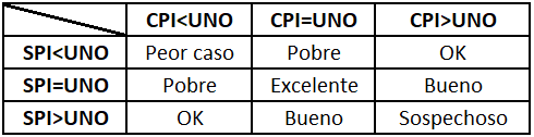 - Donde CPI y SPI son ambos menores que uno, reconocemos el desempeño peor caso. Esto ocurre en un caso. Este es el caso de prometer demasiado y cumplir poco.