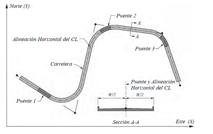 Este artículo describe los elementos utilizados para la geometría en planta de una carretera. La Figura 1 presenta una vista en planta de un proyecto vial que contiene tres puentes. La trayectoria que sigue la carretera en la vista en planta se llama alineamiento horizontal. Como se ve en la sección A-A de la Figura 1, la línea de alineamiento horizontal coincide con la línea central (CL) de la carretera. Dependiendo de la agencia de carreteras que rija, la línea de alineamiento horizontal puede situarse en otras ubicaciones transversales, desplazada de la CL de una carretera, como una línea de carril, línea de hombro o línea de cuneta.