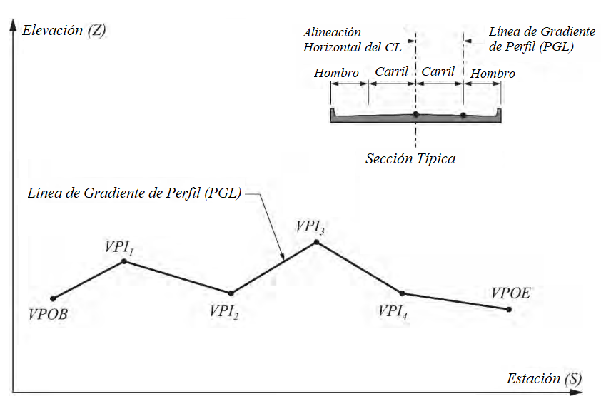 Los perfiles verticales se utilizan para establecer las elevaciones a lo largo de los proyectos viales. Los perfiles verticales están compuestos por una serie de líneas de pendiente constante conectadas en puntos de intersección vertical (VPIs). Toda la serie continua de segmentos de línea representa la línea de perfil de pendiente (PGL). La Figura 2 muestra una representación en 2D de una PGL que servirá como alineamiento vertical de ejemplo en este artículo. La PGL se presenta en un sistema de coordenadas donde el eje x es el estacionamiento a lo largo de una línea base asociada y el eje y es la elevación. Al igual que los alineamientos horizontales, las PGLs son dependientes de la dirección. La PGL comienza con el punto vertical de inicio (VPOB), pasa por los VPIs sucesivos y termina con el punto vertical de finalización (VPOE).