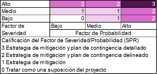 Para las áreas con al menos una severidad o probabilidad media (SPR de 1), se deben desarrollar estrategias de mitigación. Luego, si el monitoreo muestra un aumento en el riesgo durante el proyecto, se debe considerar un plan de contingencia. Aquellos riesgos con severidad y probabilidad bajas (es decir, SPR de 0) deben tener una métrica establecida para permitir el monitoreo. Es decir, el riesgo debe tratarse como una suposición del proyecto y abordarse de la misma manera.