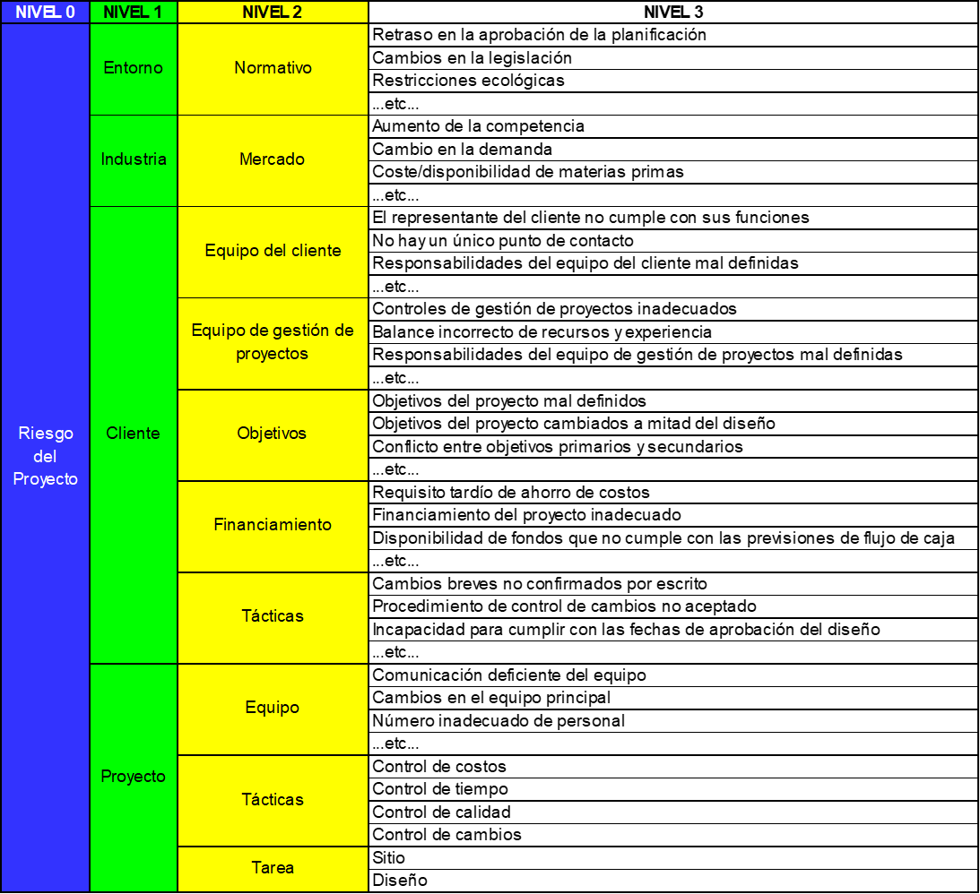 Algunos autores y practicantes han ido más allá en la estructuración del riesgo que simplemente enumerar tipos de riesgos que enfrenta un proyecto. Estos han producido estructuras jerárquicas con varios nombres para describir fuentes de riesgos, o categorías o tipos de riesgos, aunque generalmente se centran en un tipo particular de proyecto o área de aplicación. Ejemplos incluyen la "taxonomía de riesgos" para proyectos de desarrollo de software del Software Engineering Institute, una "lista de identificación de riesgos" para un proyecto de construcción de línea de transmisión de alta tensión, una "estructura de desglose de identificación de riesgos" para proyectos de construcción y una "taxonomía basada en riesgos" para grandes proyectos de ingeniería. Cada una de estas estructuras contiene tres o cuatro niveles jerárquicos para describir los tipos de riesgos que enfrenta el proyecto en cuestión. La Tabla 1 y la Tabla 2 presentan dos de estos ejemplos.